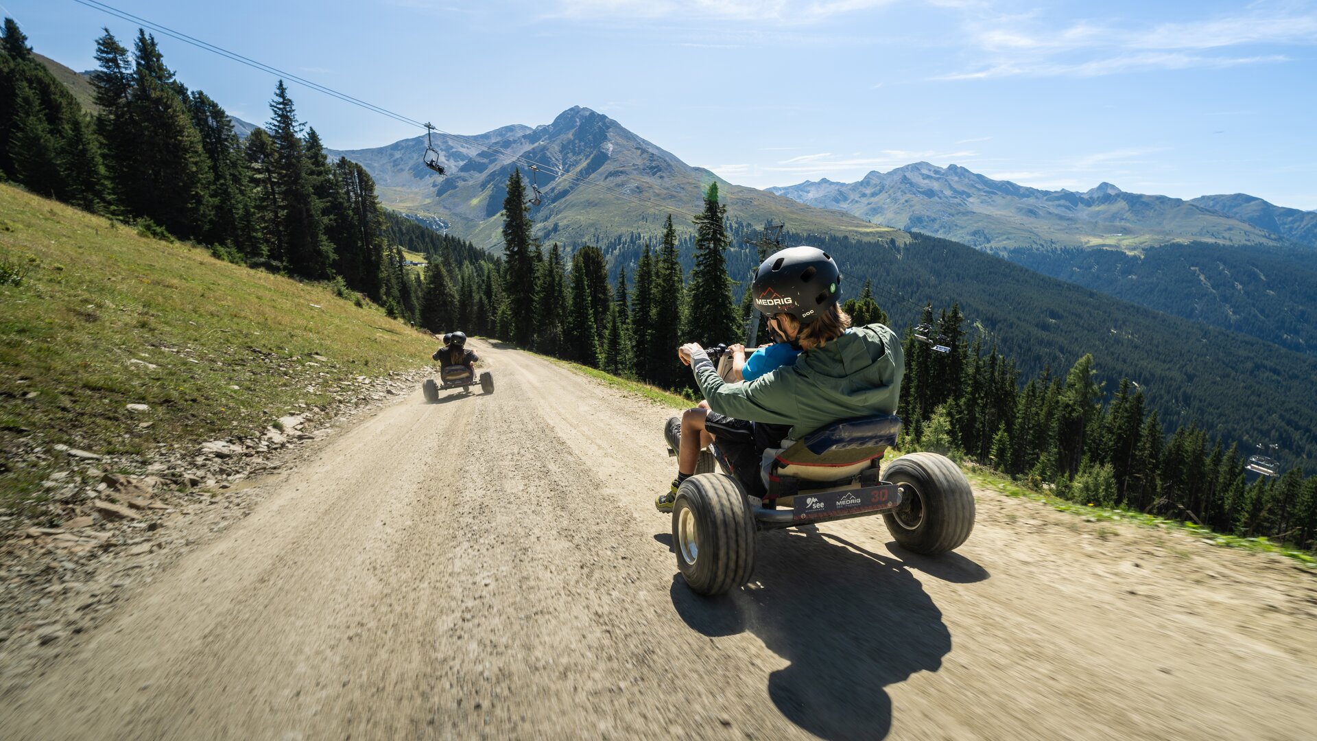 Erlebe pures Adrenalin beim Mountaincartfahren in See im Paznaun und genieße ein actionreiches Sommererlebnis in Tirol. Mit den Medrig Carts geht es rasant von der Bergstation der Zeinisbahn bis zur Talstation der Zeinisbahn – über eine 3,5 Kilometer lange Strecke mit beeindruckender Bergkulisse. Die Abfahrt verbindet Tempo, Fahrspaß und Naturerlebnis und ist ideal für alle, die im Urlaub, mit Freunden oder mit der Familie nach einem besonderen Outdoor-Abenteuer suchen.
