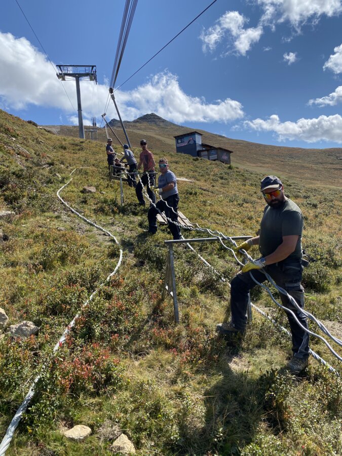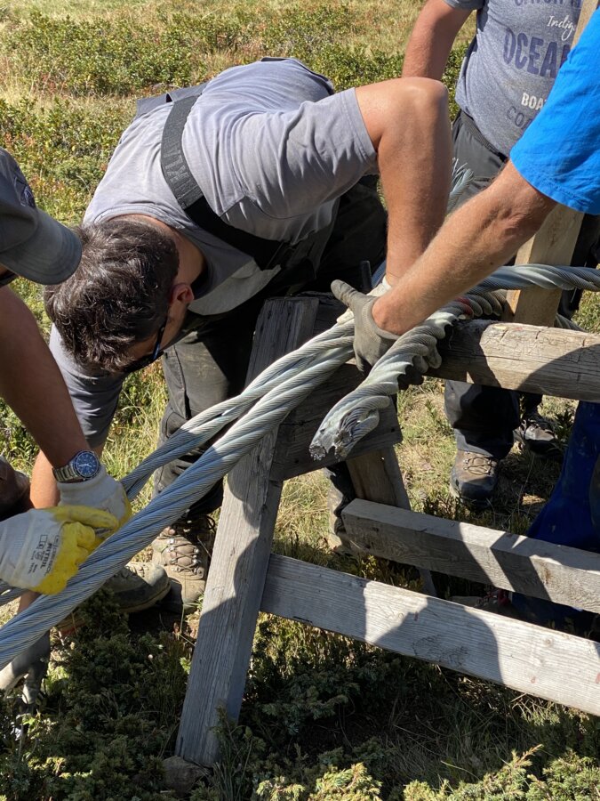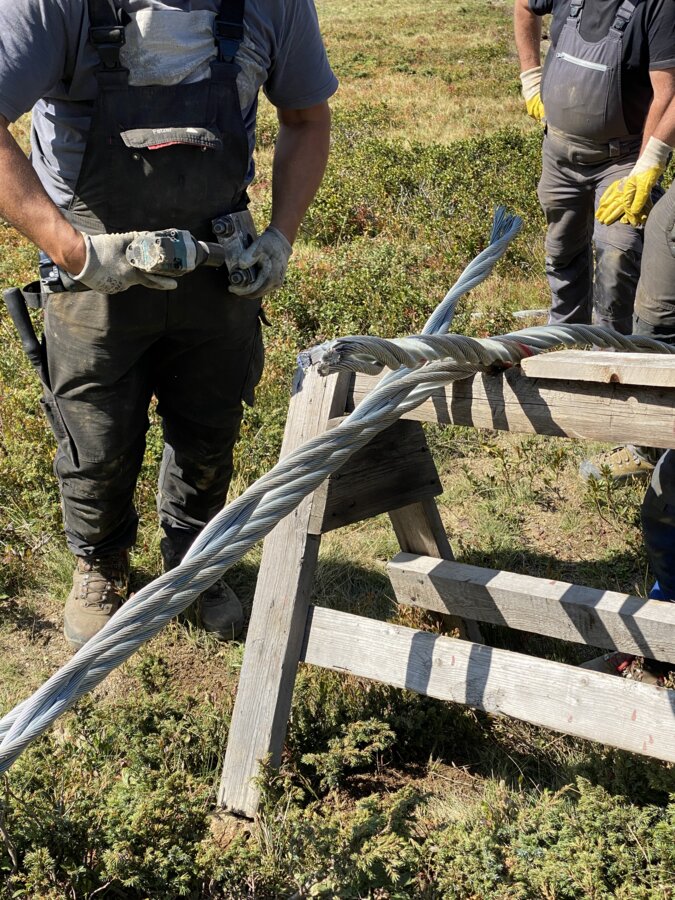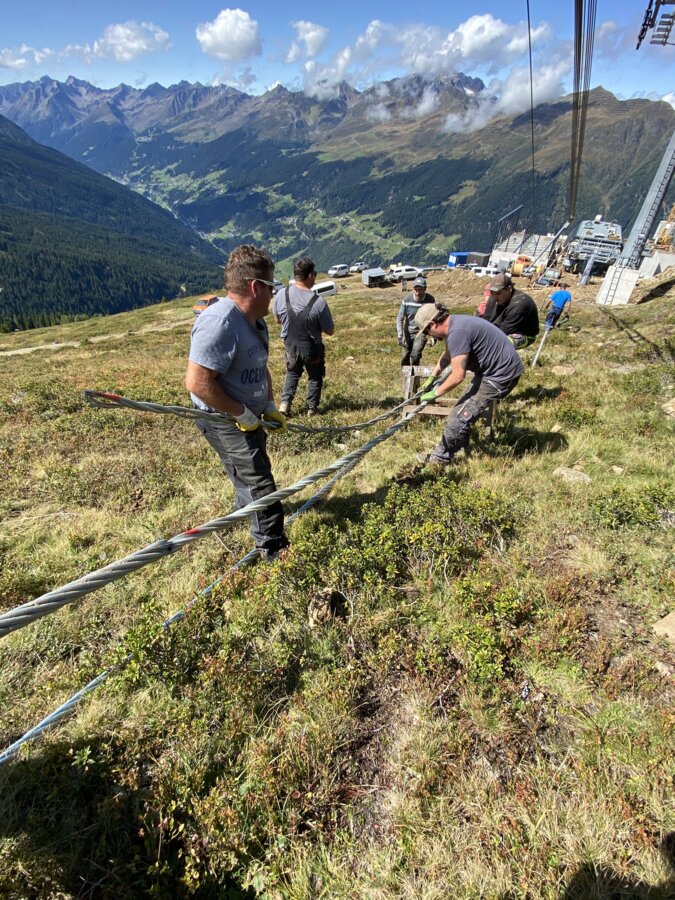 Nach dem erfolgreichen Einziehen folgt der Seilspleiß, ein echter Höhepunkt im Bauablauf. Hierbei werden die beiden Enden des Seils miteinander verflochten und millimetergenau verbunden. Dieser Arbeitsschritt ist Handwerk auf höchstem Niveau und wird von einem speziell geschulten Team durchgeführt. Das Resultat: ein endloses, geschlossenen Seil, das die Grundlage für den späteren Betrieb bildet.